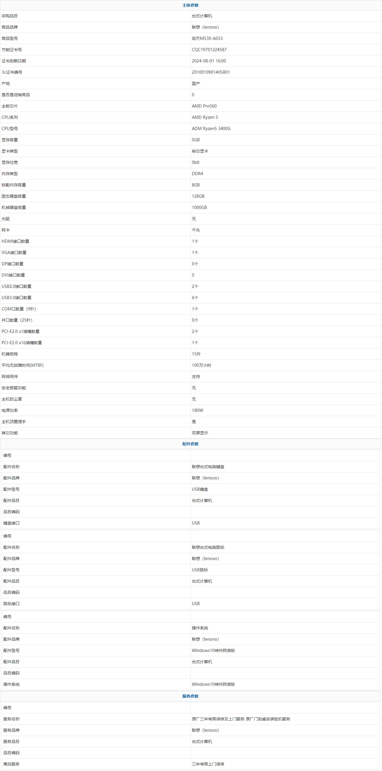 - 商品名稱:聯(lián)想(lenovo) 啟天M530-A033 AMD Ryzen 5 ADM Ryzen5 3400G 8GB 1000GB 128GB Windows10神州網(wǎng)信版 三年有限上門(mén)保修