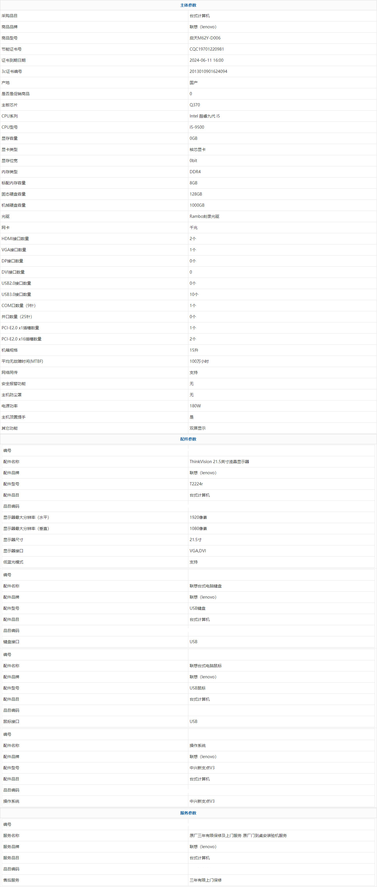 - 商品名稱:聯(lián)想(lenovo) 啟天M62Y-D006 Intel 酷睿九代 i5 i5-9500 8GB 1000GB 128GB 中興新支點(diǎn)V3 21.5寸 三年有限上門保修