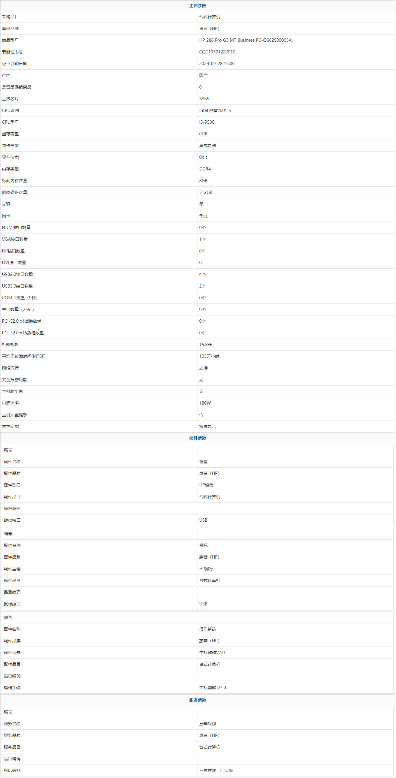 • 商品名稱:惠普(HP) HP 288 Pro G5 MT Business PC-Q602500005A Intel 酷睿九代 i5 i5-9500 8GB 512GB 中標(biāo)麒麟 V7.0 三年有限上門保修
