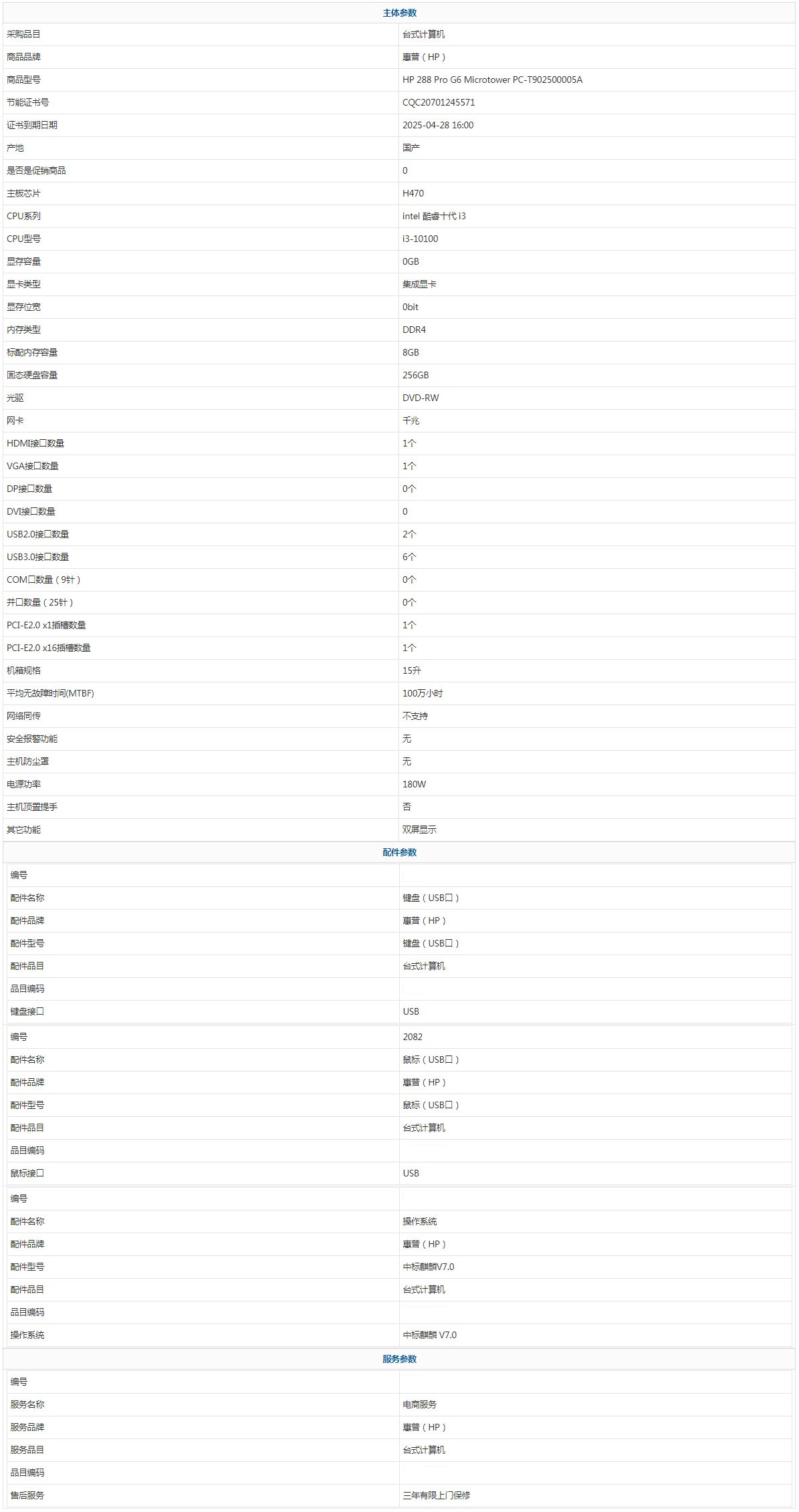 • 商品名稱:惠普(HP) HP 288 Pro G6 Microtower PC-T902500005A intel 酷睿十代 i3 i3-10100 8GB 256GB 中標(biāo)麒麟 V7.0 三年有限上門保修