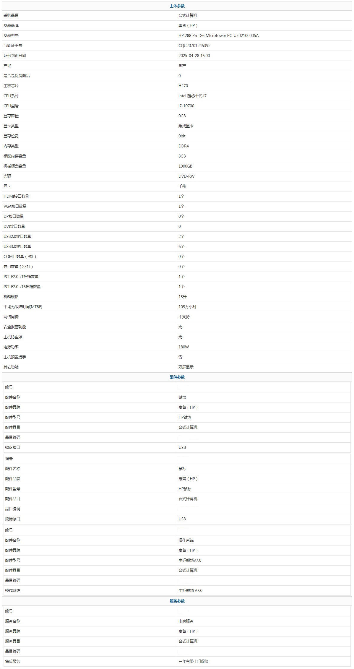 - 商品名稱:惠普(HP) HP 288 Pro G6 Microtower PC-U302100005A intel 酷睿十代 i7 i7-10700 8GB 1000GB 中標麒麟 V7.0 三年有限上門保修