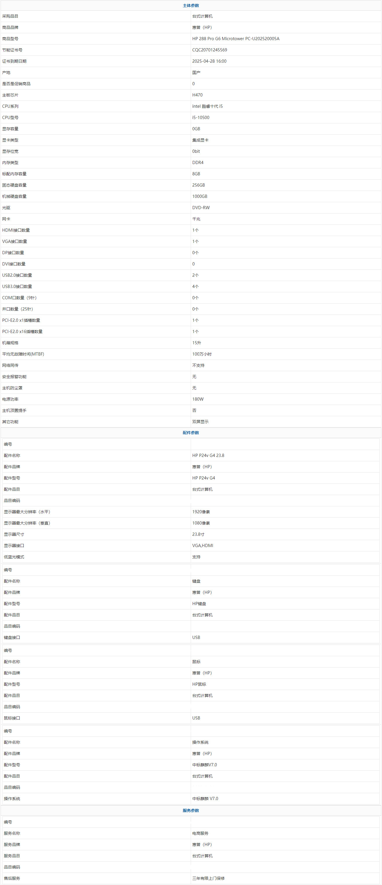 - 商品名稱:惠普(HP) HP 288 Pro G6 Microtower PC-U202520005A intel 酷睿十代 i5 i5-10500 8GB 1000GB 256GB 中標(biāo)麒麟 V7.0 23.8寸 三年有限上門保修