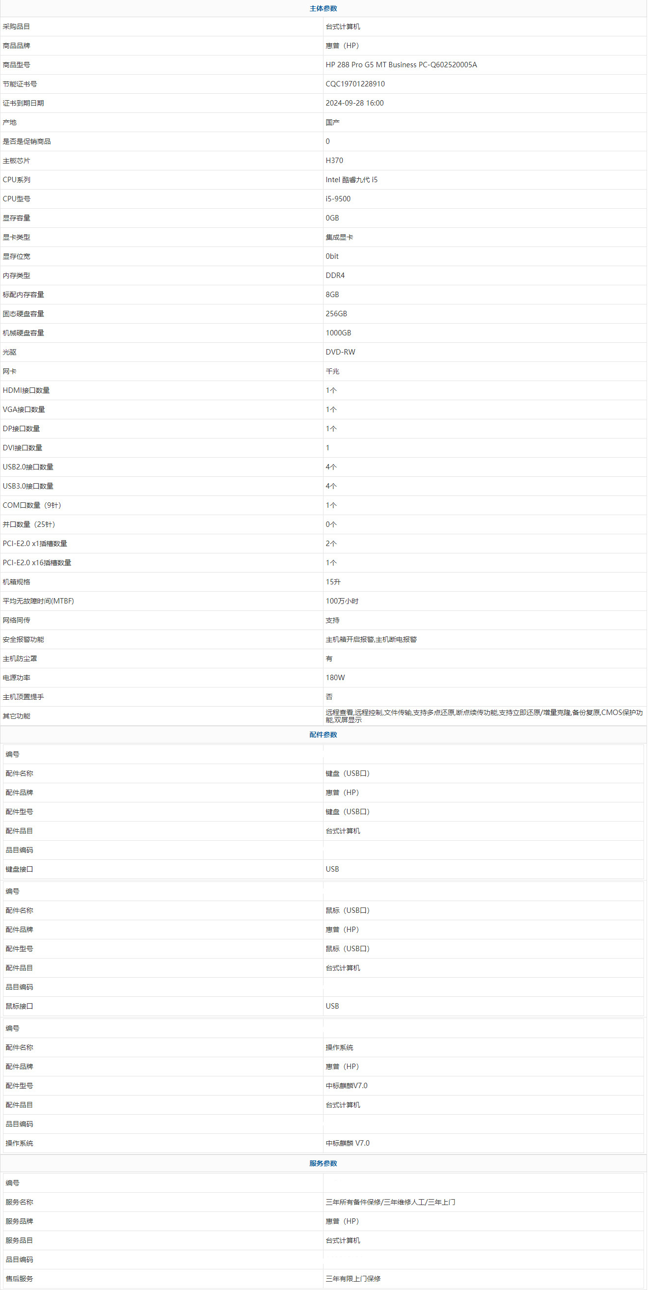- 商品名稱:惠普(HP) HP 288 Pro G5 MT Business PC-Q602520005A Intel 酷睿九代 i5 i5-9500 8GB 1000GB 256GB 中標(biāo)麒麟 V7.0 三年有限上門保修