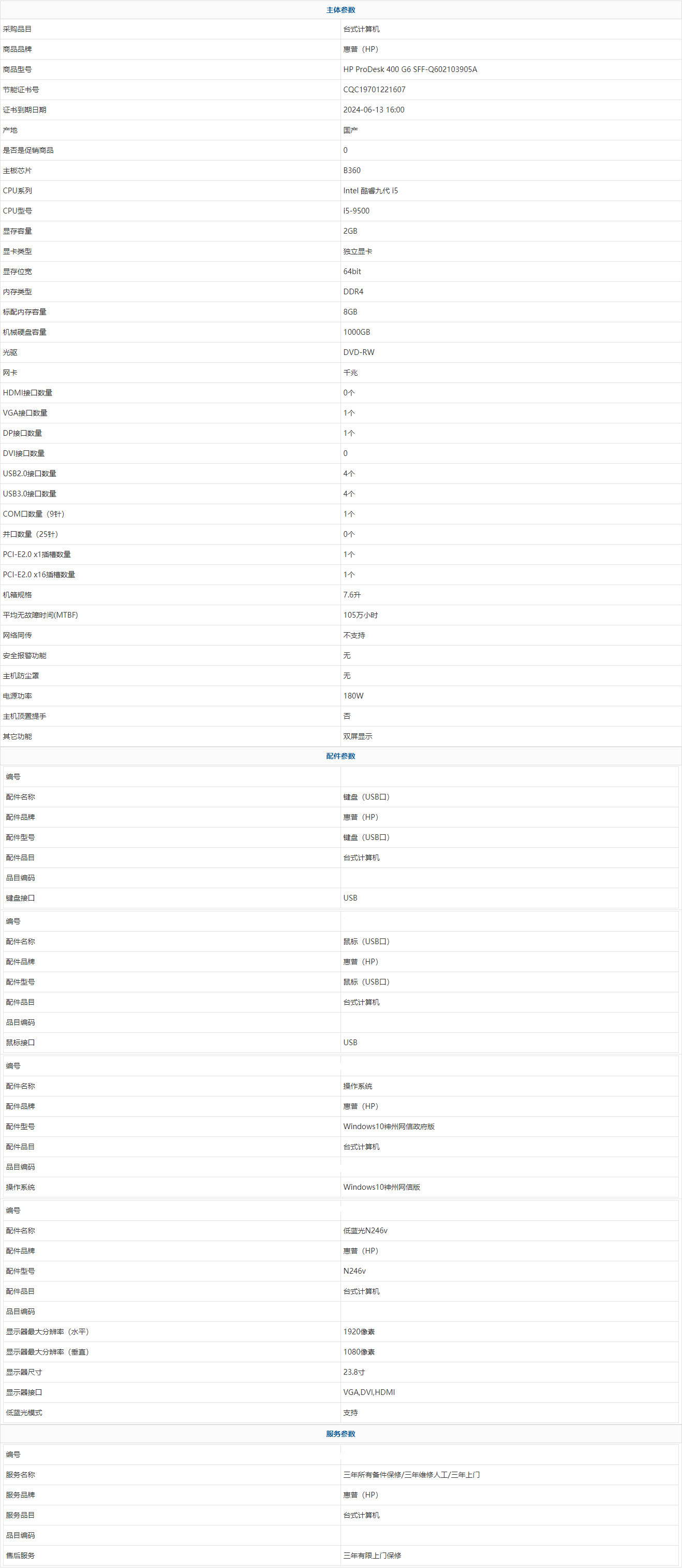 - 商品名稱:惠普(HP) HP ProDesk 400 G6 SFF-Q602103905A Intel 酷睿九代 i5 i5-9500 8GB 1000GB Windows10神州網(wǎng)信版 23.8寸 三年有限上門保修