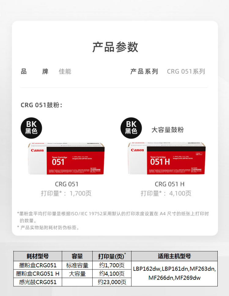 • 商品名稱:佳能(Canon) CRG 051 H 大容量黑色墨粉盒 印量約4100頁(yè)