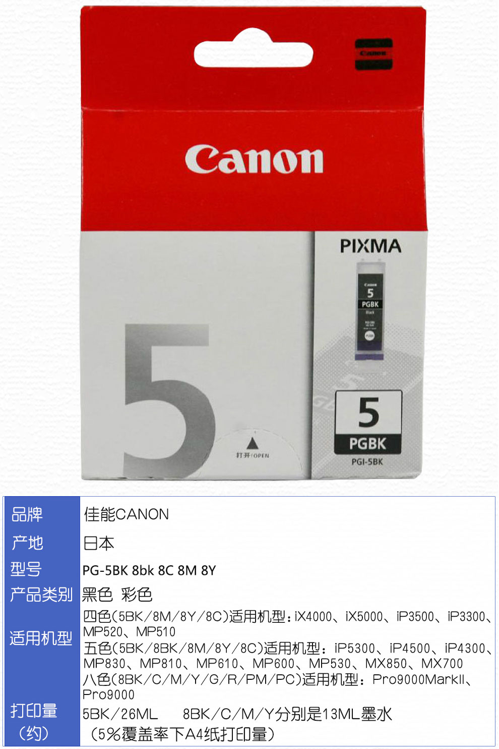 • 商品名稱:佳能(Canon) PGI-5 Black 黑色墨盒 打印量-頁(yè) 適用于iP5300、iP4500、iP4300、iP3500、iP3300、MP830、MP810、MP610、MP600、MP530、MP520、MP510、MX850、MX700、iX4000
