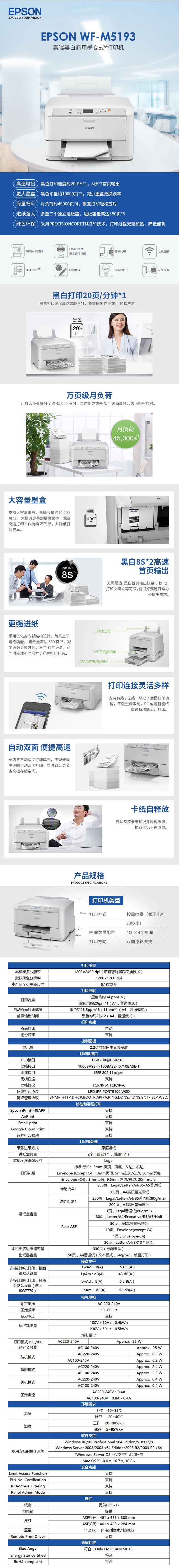 • 商品名稱:愛(ài)普生(EPSON)WF-M5193黑白商用墨倉(cāng)式打印機(jī)加單紙盒