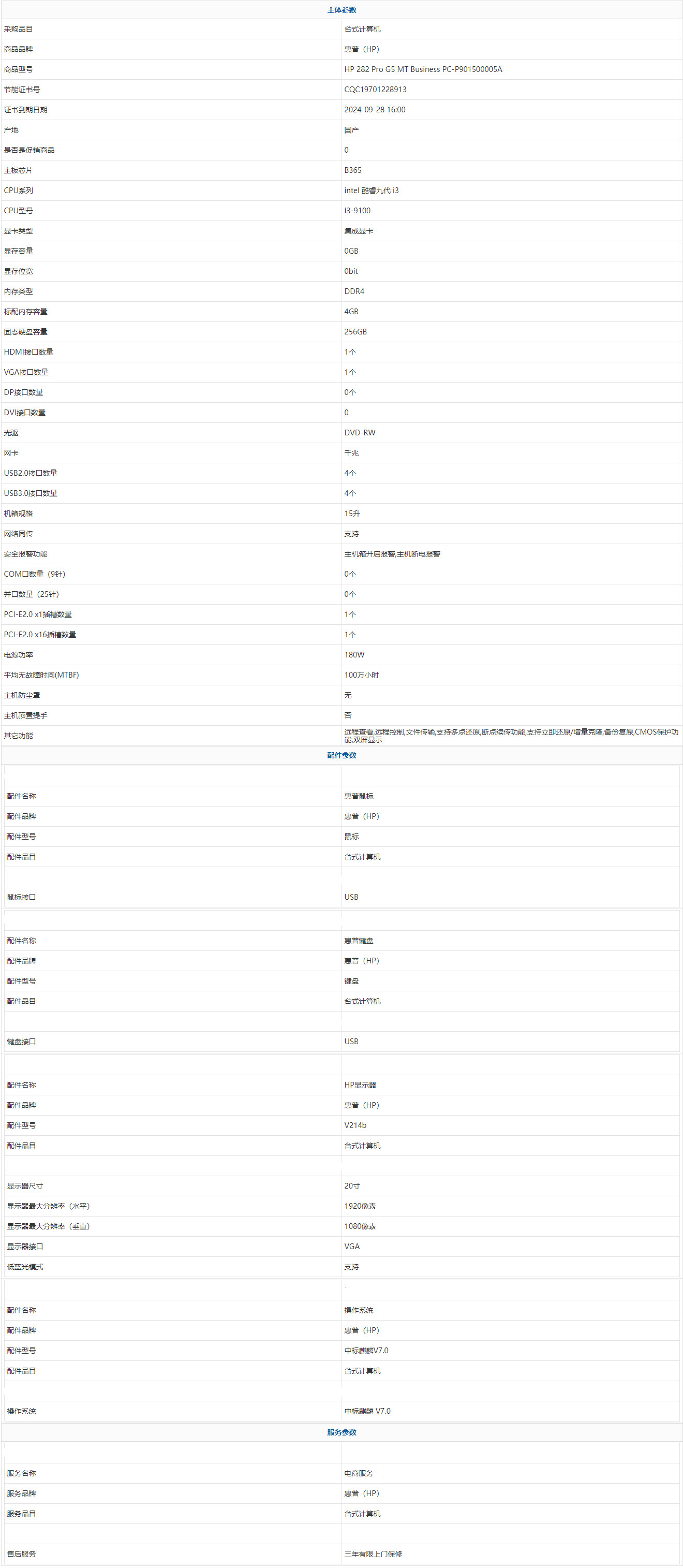 - 商品名稱(chēng):惠普(HP) HP 282 Pro G5 MT Business PC-P901500005A intel 酷睿九代 i3 i3-9100 4GB 256GB 中標(biāo)麒麟 V7.0 20寸 三年有限上門(mén)保修