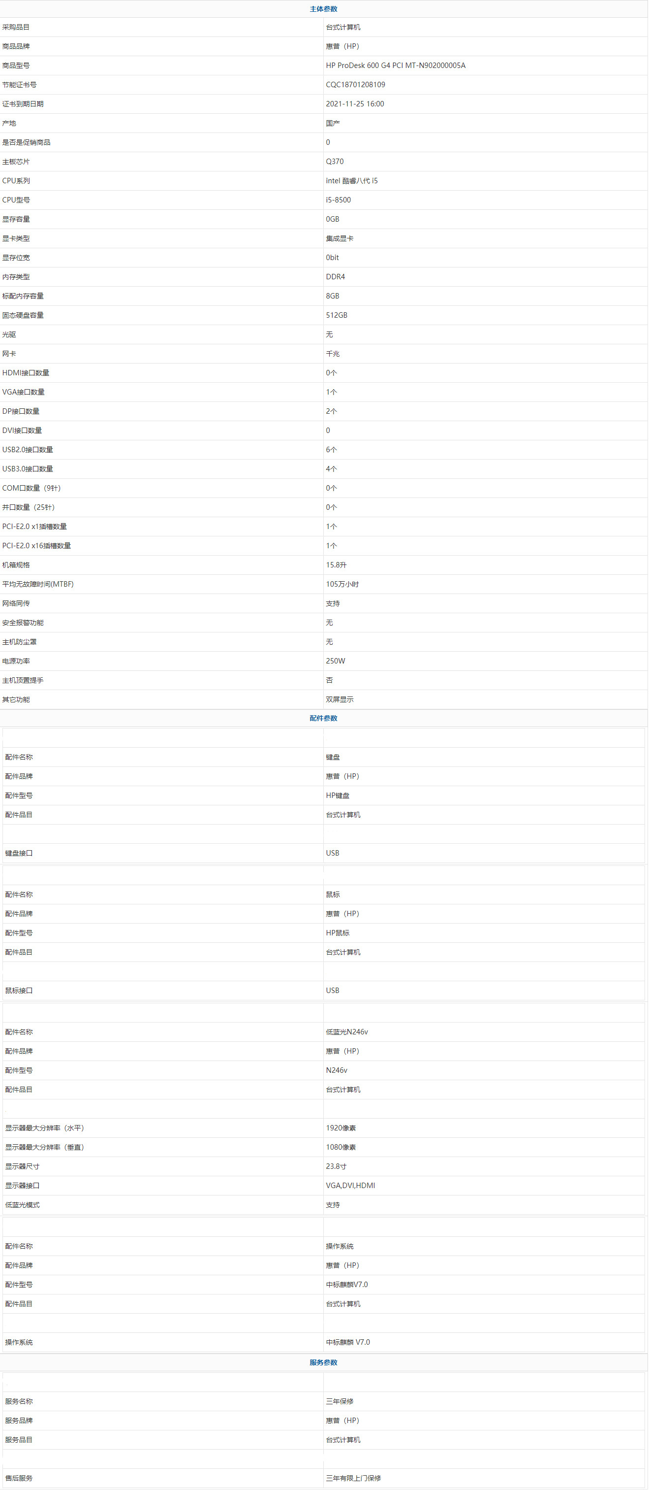 惠普(HP) HP ProDesk 600 G4 PCI MT-N902000005A intel 酷睿八代 i5 i5-8500 8GB 512GB 中標(biāo)麒麟 V7.0 23.8寸 三年有限上門(mén)保修