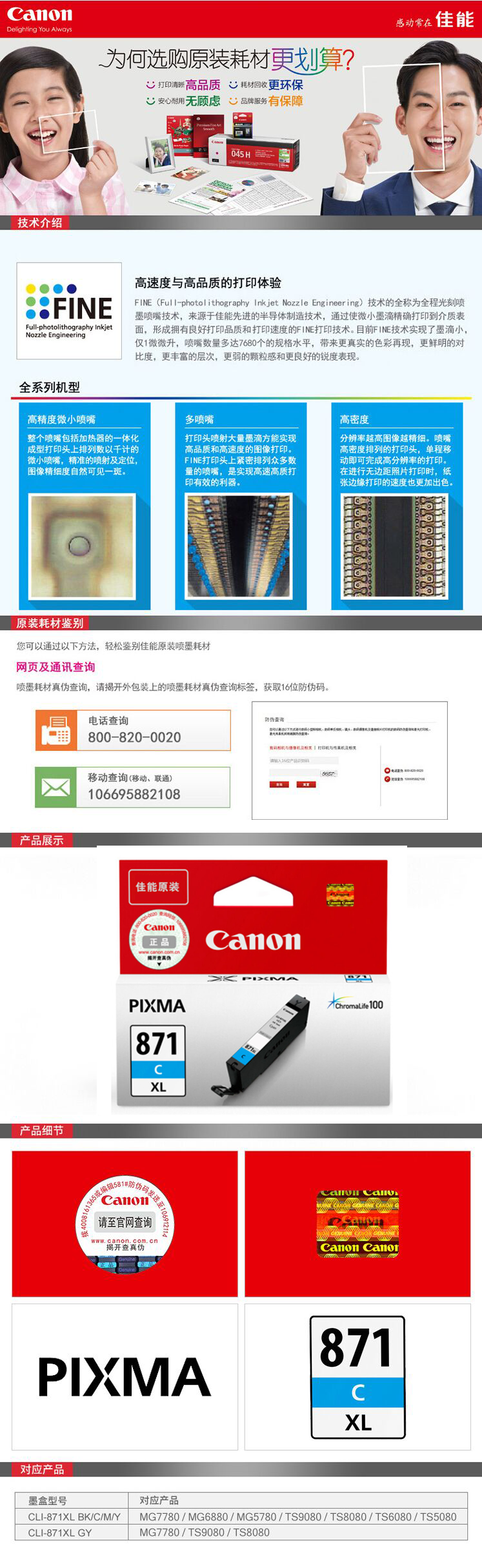 • 商品名稱:佳能(Canon) CLI-871XL C 大容量青色墨盒