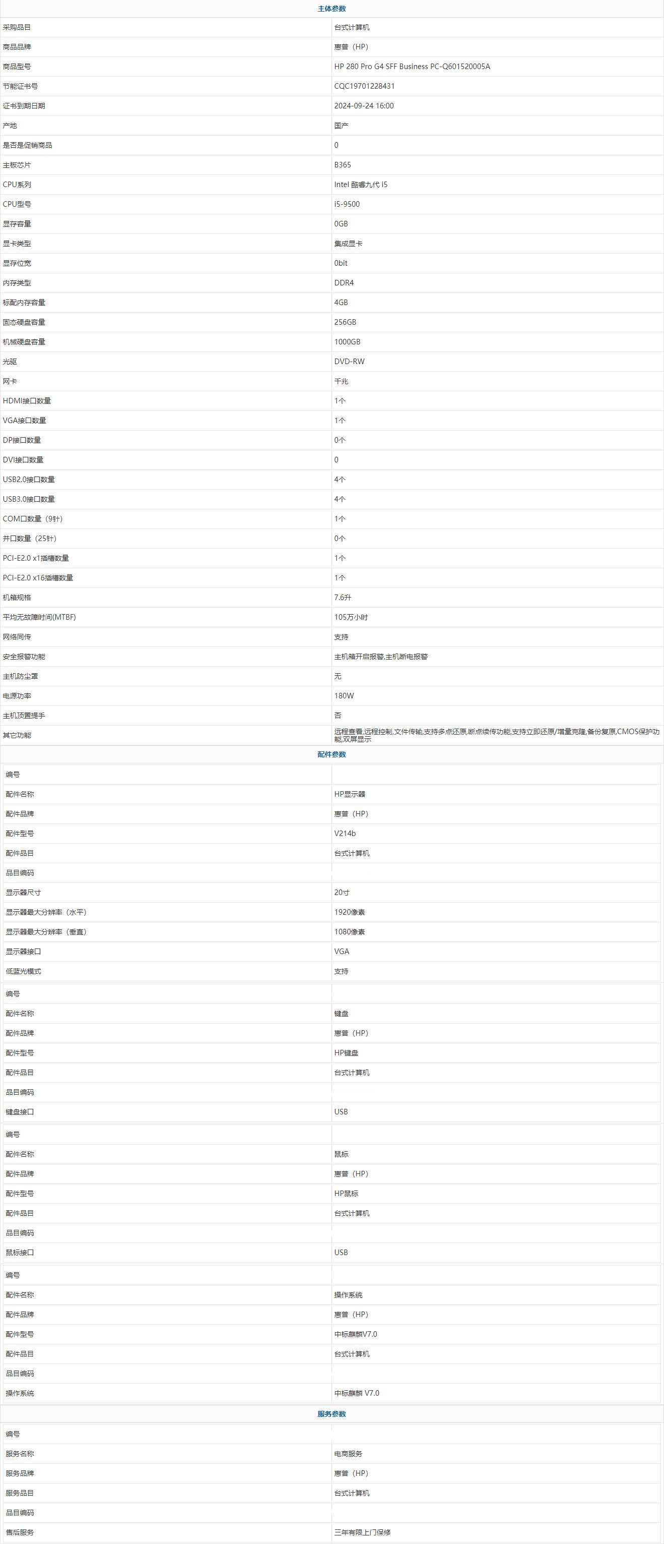 - 商品名稱:惠普(HP) HP 280 Pro G4 SFF Business PC-Q601520005A Intel 酷睿九代 i5 i5-9500 4GB 1000GB 256GB 中標麒麟 V7.0 20寸 三年有限上門保修