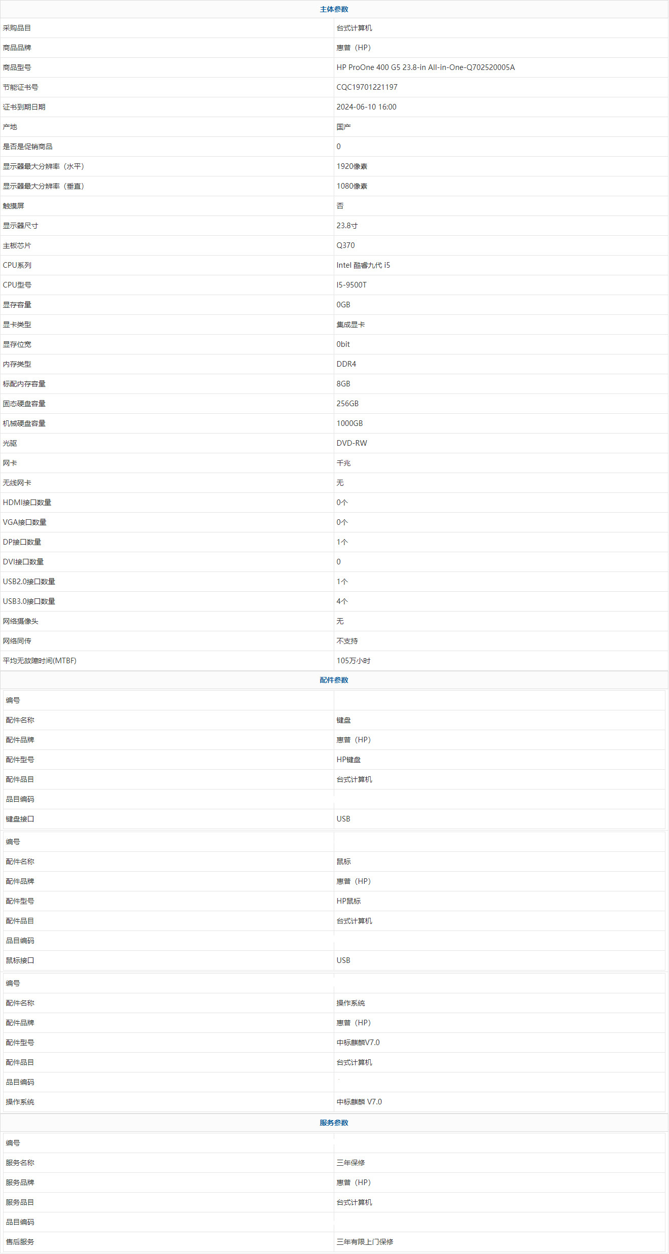 • 商品名稱:惠普(HP) HP ProOne 400 G5 23.8-in All-in-One-Q702520005A Intel 酷睿九代 i5 I5-9500T 8GB 1000GB 256GB 中標(biāo)麒麟 V7.0 23.8寸 三年有限上門保修