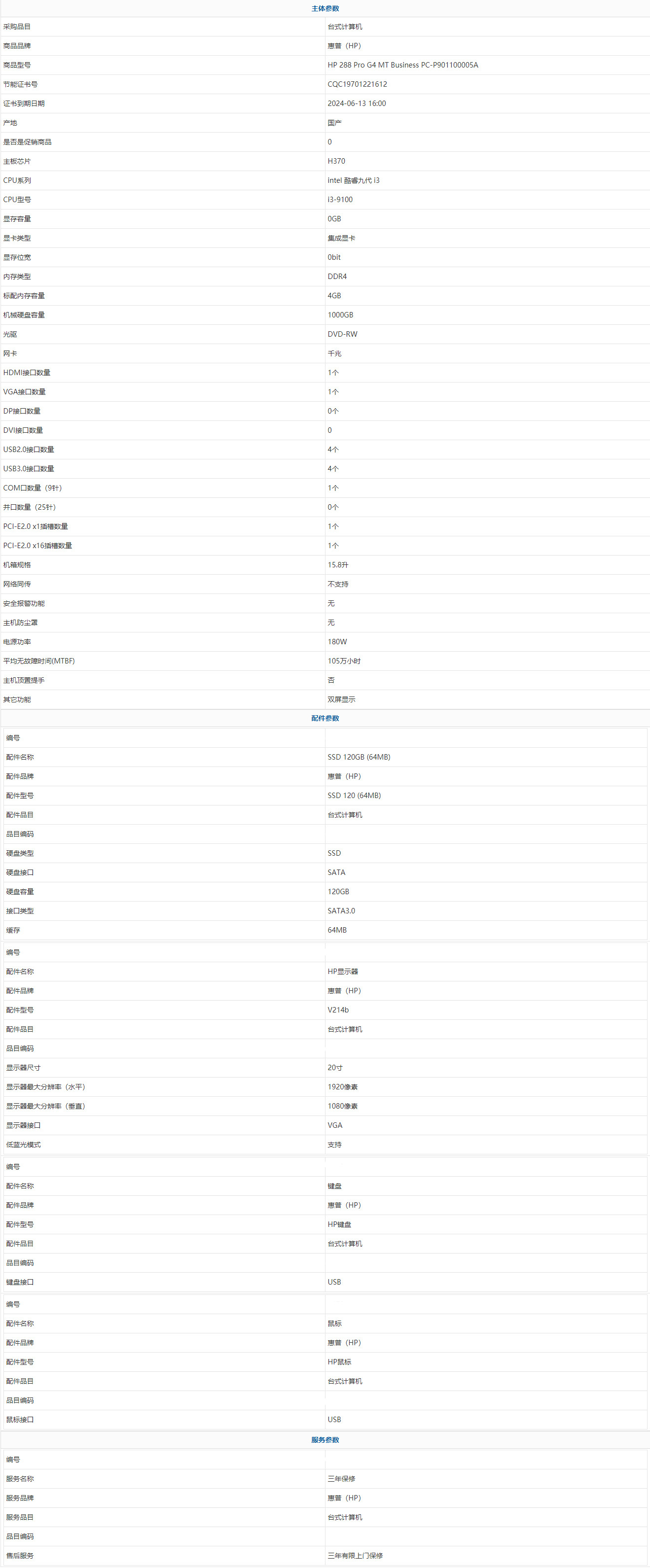 • 商品名稱:惠普(HP) HP 288 Pro G4 MT Business PC-P901100005A intel 酷睿九代 i3 i3-9100 4GB 1000GB 20寸 三年有限上門保修