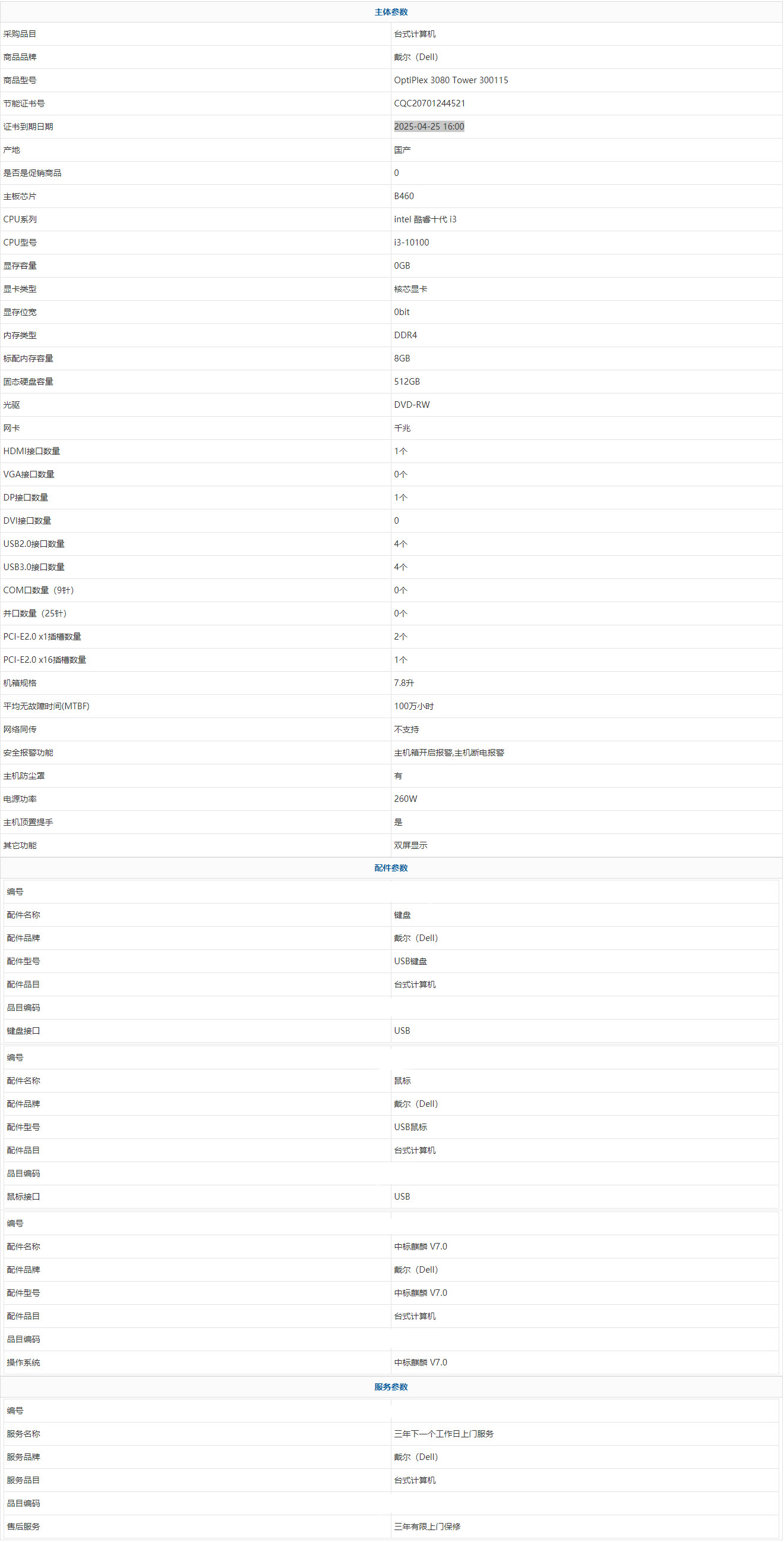 • 商品名稱:戴爾(Dell) OptiPlex 3080 Tower 300115 intel 酷睿十代 i3 i3-10100 8GB 512GB 中標(biāo)麒麟 V7.0 三年有限上門保修