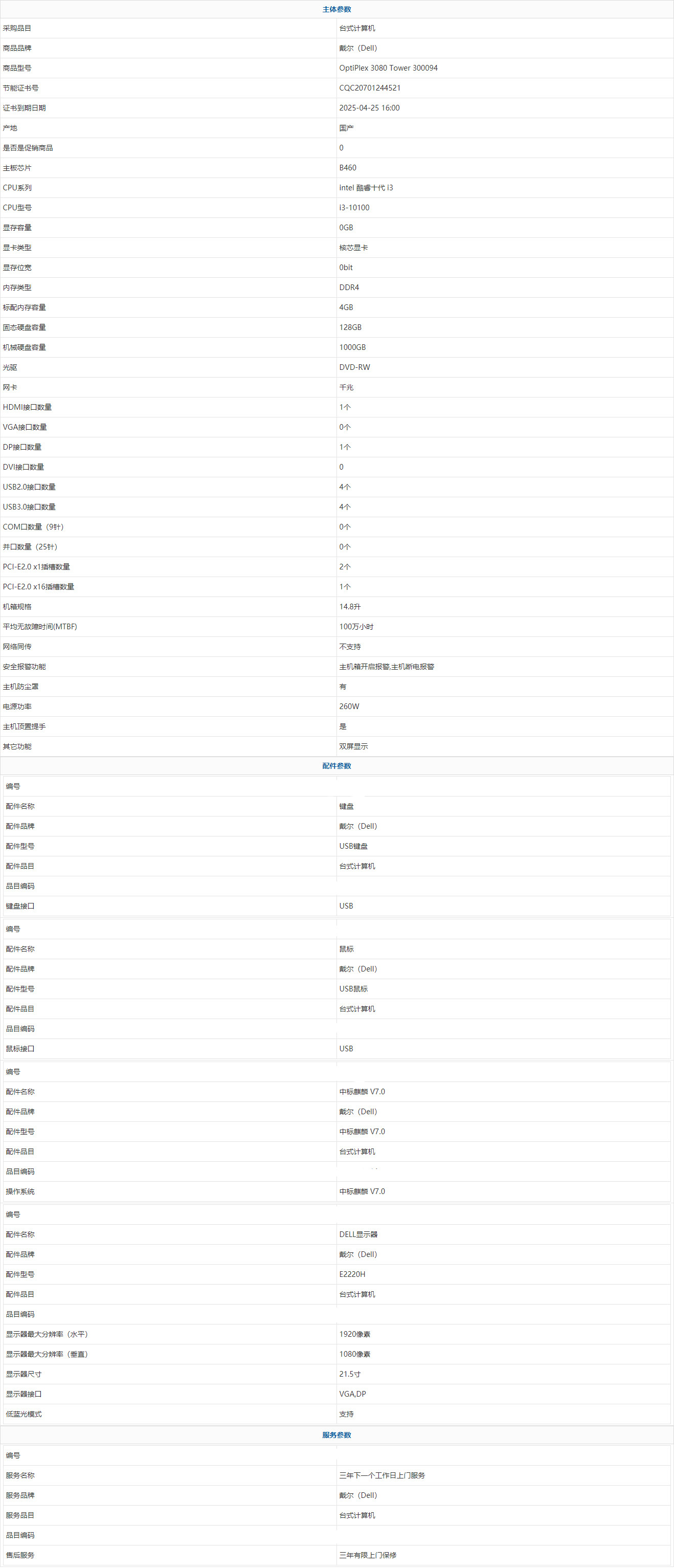 • 商品名稱:戴爾(Dell) OptiPlex 3080 Tower 300094 intel 酷睿十代 i3 i3-10100 4GB 1000GB 128GB 中標麒麟 V7.0 21.5寸 三年有限上門保修