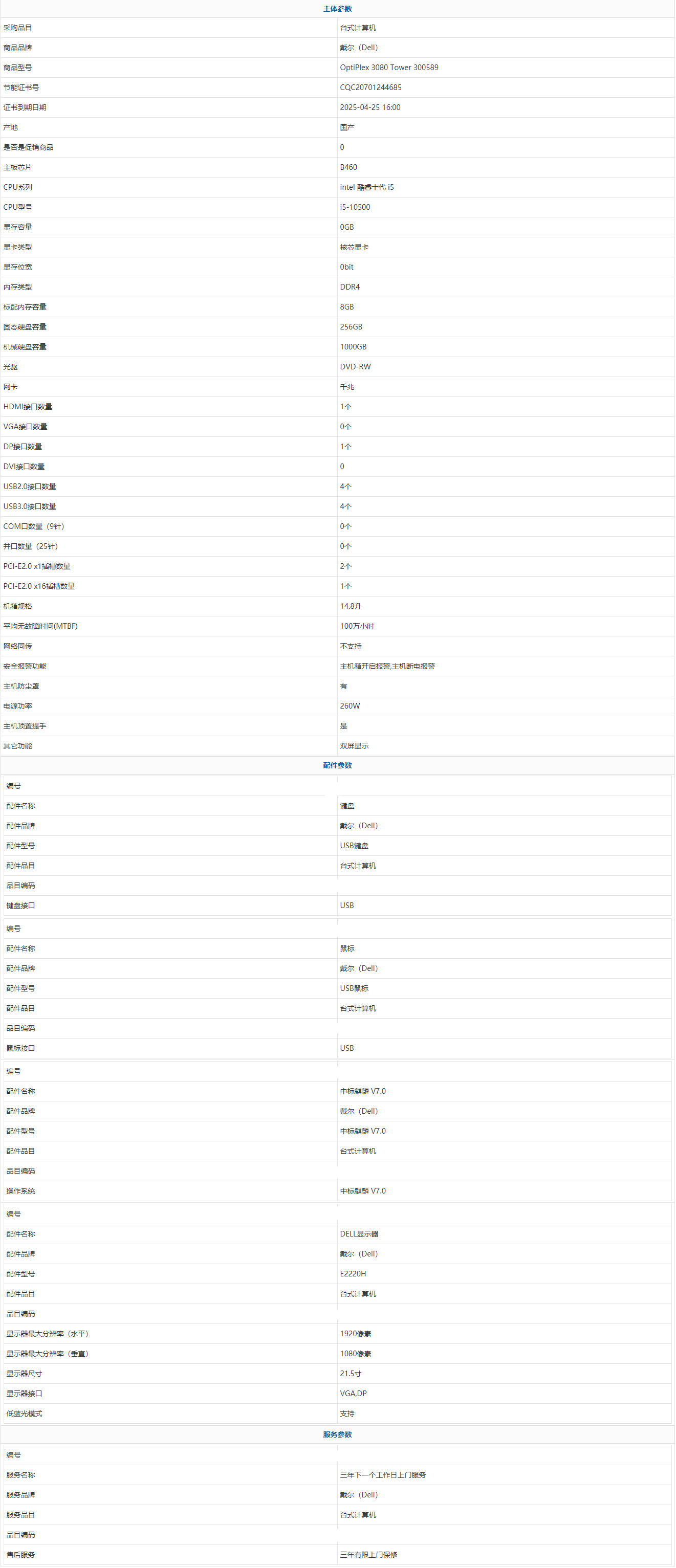 戴爾(Dell) OptiPlex 3080 Tower 300589 intel 酷睿十代 i5 i5-10500 8GB 1000GB 256GB 中標(biāo)麒麟 V7.0 21.5寸 三年有限上門保修